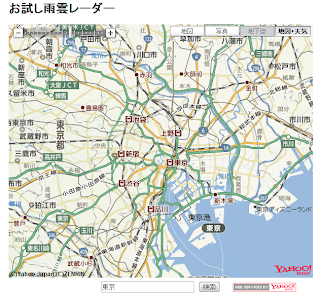 このサンプルは、Yahooさんが提供する「ルートラボ」との連携サンプルだが、場所検索機能があったので、これに、雨雲レーダー表示機能を追加すれば、気になる場所の雨雲情報が見れるぞ!ということで追加。